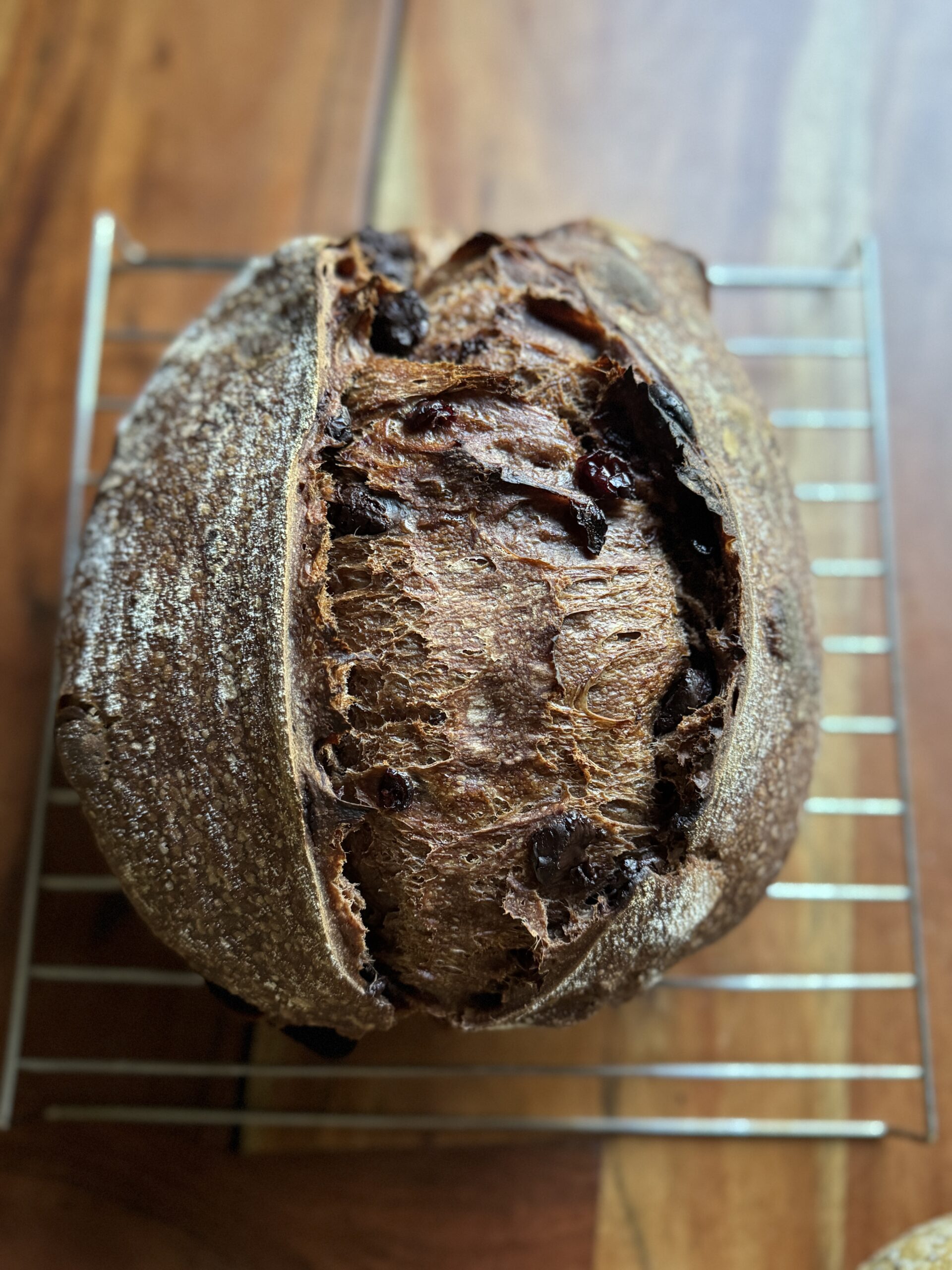 Ingredients: Organic hard red wheat, organic malted barley flour, organic rye flour, water, chocolate chips(Unsweetened chocolate, sugar, cocoa butter, milk fat, soy lecithin, vanilla extract), cranberries, cocoa powder, sea salt.